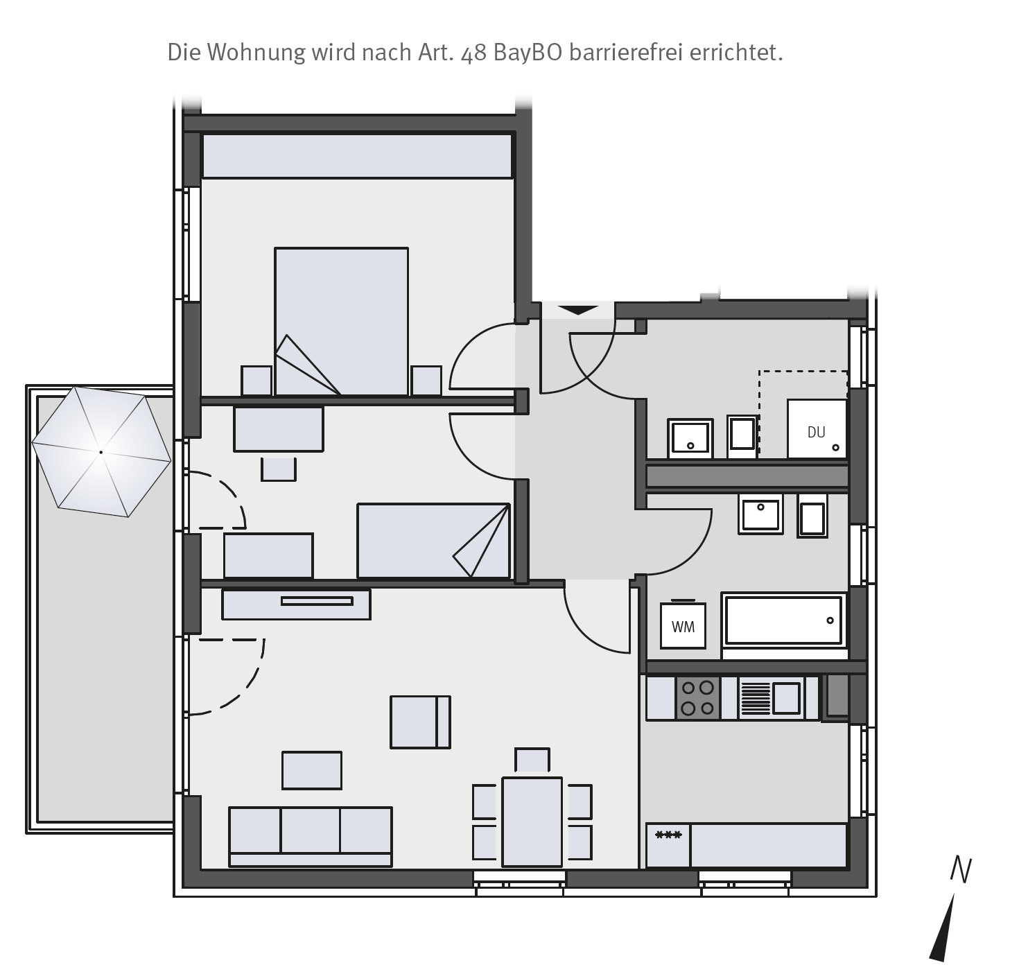 Die Wohnungen haben Wohnflächen von ca. 55 m² bis 101 m² und verfügen je nach Lage über eine Terrasse mit Gartenanteil oder einen Balkon. Im Außenbereich befinden sich zahl- reiche Fahrradstellplätze, teilweise offen, teilweise überdacht und im Innenhof werden großzügige Spielbereiche entstehen. Das Mehrfamilienhaus wird nach Süden und Westen ausgerichtet sein und grenzt direkt an den westlichen Rand des weitläufigen Landschaftspark Hachinger Tal an.